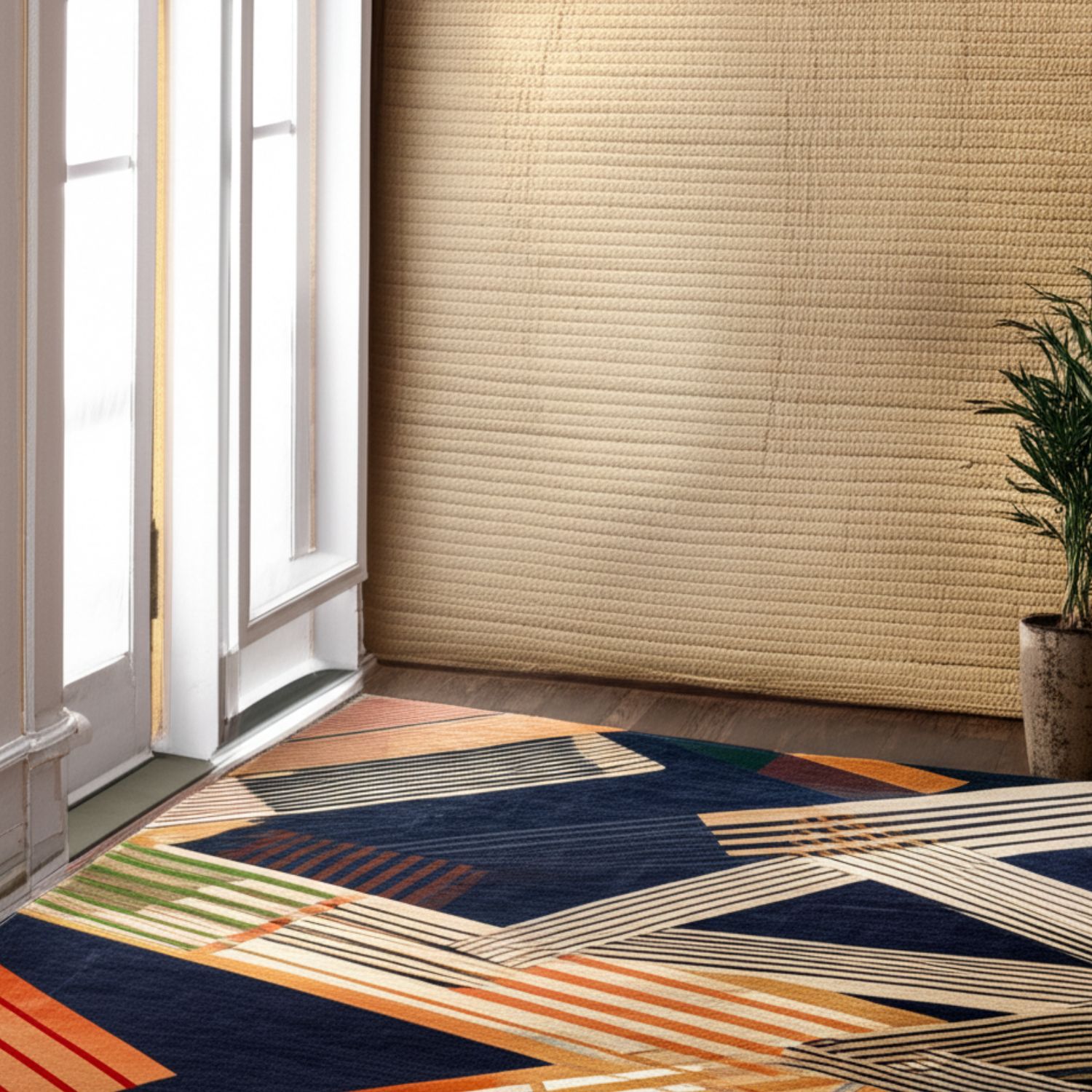 Design Tip: Let a geometric rug be the focal point—keep surrounding décor simple and solid-colored for balance.
